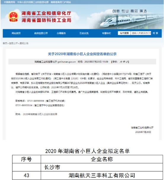 近日,湖南省工業(yè)和信息化廳官網(wǎng)關于2020年湖南省小巨人企業(yè)名單公示結束。經(jīng)市州工信局、省財政直管縣工信部門審核推薦、專家評審,認定267家企業(yè)為2020年湖南省小巨人企業(yè),其中湖南航天三豐公司榜上有名。