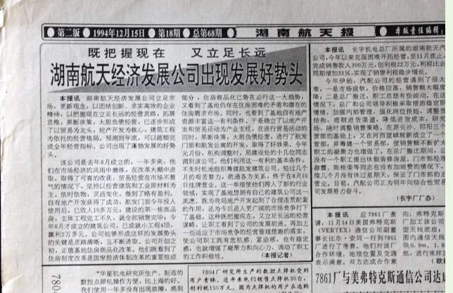 航發(fā)公司成立于19938月,最初從貿(mào)易起家,成立一年多后,實現(xiàn)了以極少的資源和投入實現(xiàn)發(fā)展盈利。當時的湖南航天整體搬遷至長沙,處于“謀發(fā)展、求新生”的階段,短時間內(nèi)能夠取得這樣的發(fā)展好勢頭顯得格外珍貴。湖南航天報相關(guān)記者在了解這一情況后特撰寫通訊文章來鼓舞職工士氣。今天是湖南航天成立54周年,回看這一篇報道,仍覺振奮。祝湖南航天生日快樂,越來越好!